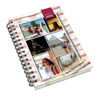 Medidas: 14.8 x 21 cm. (A5) Carátula personalizada Nombre en la cubierta Hojas en bond o papelería fina (Kimberly/Favini Marfil Granito 90 g.) Tapa dura Espiralado doble ring (fácil manipulación) Planing mensual Frases de reflexión (semanal)